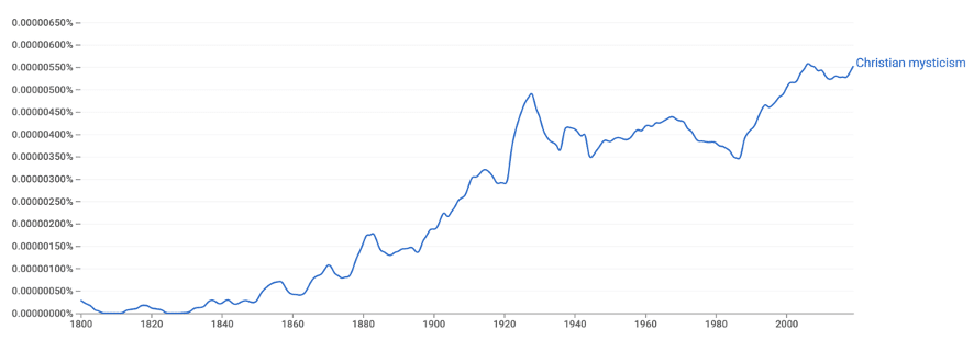 Recent years have seen a notable resurgence of interest in mysticism within Christian circles. Google’s Ngram[1] shows a slow and steady increase in the use of the term “mysticism”.[2] Notably, the term “Christian mysticism”, shows an even sharper increase. Although, before 1900, it was little used, unlike the more generic term “mysticism” (see figure 1).