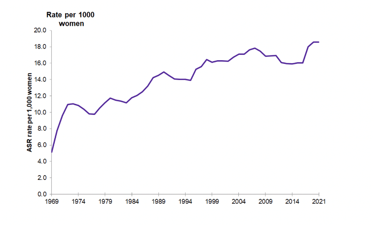 Figure 1 – age-standardised abortion rate per 1,000 women aged 15 to 44, England and Wales, 1969 to 2021 (taken from www.gov.uk/government/statistics/abortion-statistics-for-england-and-wales-2021/)