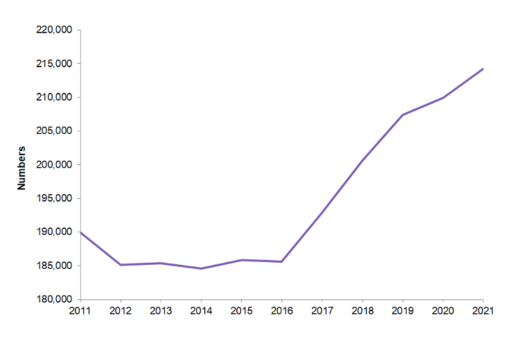 Figure 2 – number of abortions, England and Wales, 2011 to 2021 (taken from www.gov.uk/government/statistics/abortion-statistics-for-england-and-wales-2021/)